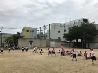 ソフトボール投げをしています。遠くまで飛ばせるかな。