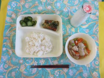 ちくわのいそべあげ、鶏肉とさといもの煮もの、あっさりきゅうり、ご飯、牛乳