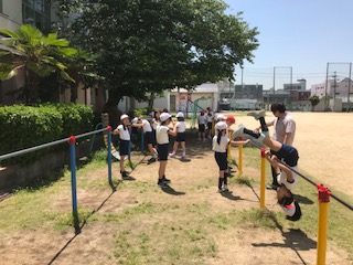 鉄棒の学習です。逆上がりの練習をしています。