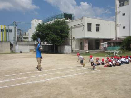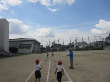 学年そろって50m走をしていました。初めての50m走ですが、みんなルールを守って一生懸命に走っていました。