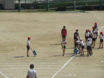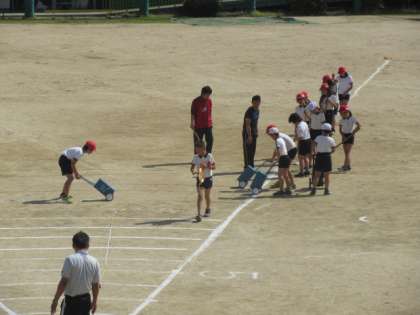 今年は、運動委員会の5・6年生と担当の先生方でラインを引きました。とても段取りよく、スムーズにきれいに引いていました。さすが高学年です。
