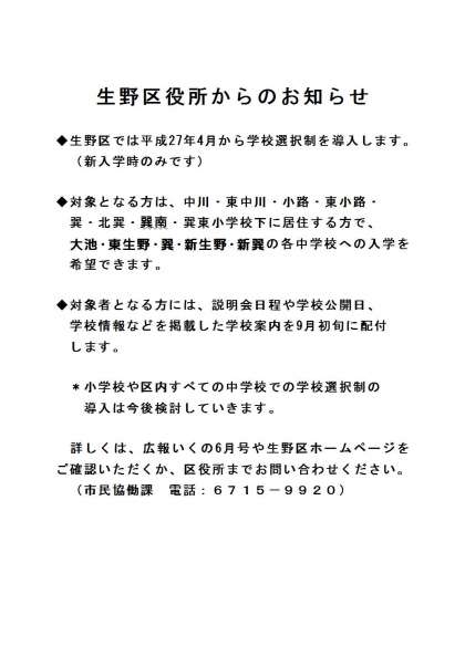 生野区役所より学校選択制について