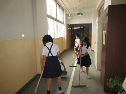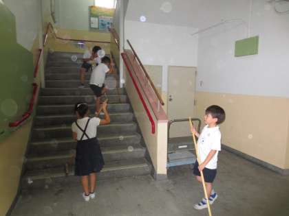 2年生が階段と職員室前廊下の「そうじ」をしています。