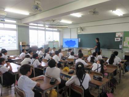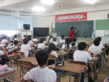 毎週水曜日の朝の時間は、英語の学習をしています。アルファベットの発音をしたり、英語の歌を歌ったり、英語かるたをしたりしています。