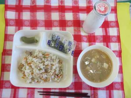 かやくご飯、みそ汁、まっ茶ういろう、牛乳