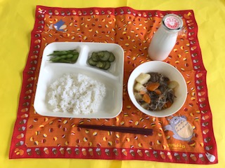 肉じゃが、きゅうりのかつお梅風味、枝豆、ご飯、牛乳