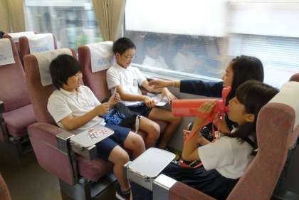 電車内の様子です。スペイン村に着くのが待ち遠しくてみんな楽しい気分でトランプなどをしています。奥田先生も楽しそうです♪