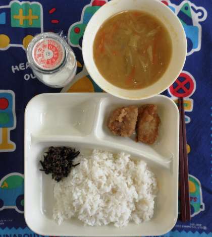 豚肉のたつたあげ、みそ汁、牛ひじきそぼろ、ご飯、牛乳