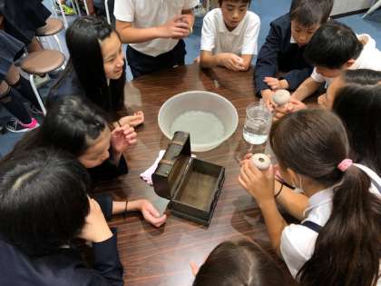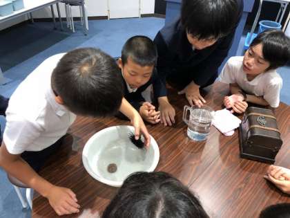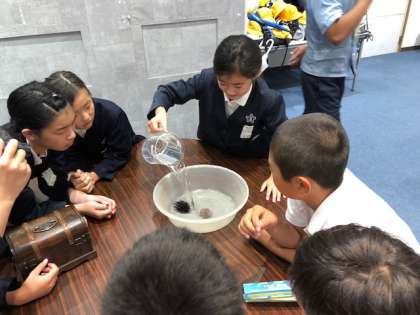 引き続き、生きもん発見教室の様子です。ウニやヤドカリなど、いろいろな生き物の秘密を発見します。