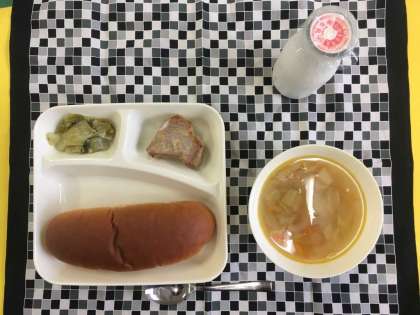 かつおのガーリックマヨネーズ焼き、スープ、レタスのサラダ、こくとうパン、牛乳
