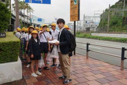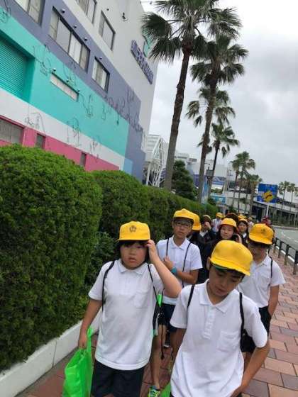 鳥羽水族館での班行動が終わって集合しました。歩いて鳥羽駅に向かいます。雨は降っていません!お土産を持っての移動になるので、行きよりは荷物が重くなります。
