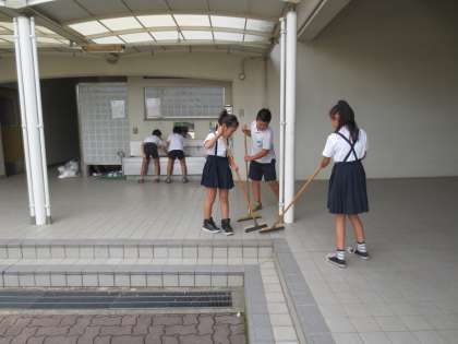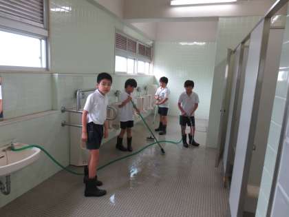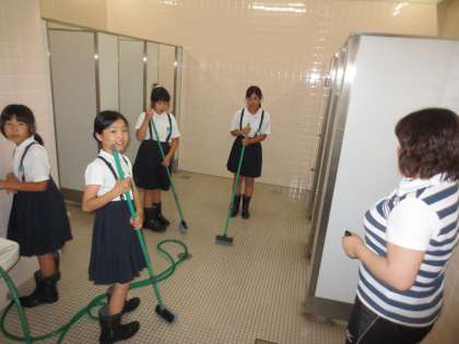 体育館横のトイレそうじを協力してやっています。週ごとにそうじ当番がかわりますが、どの当番もしっかりとやってくれています。