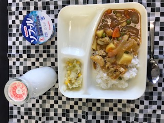 チキンカレーライス、キャベツとコーンのサラダ、ヨーグルト、牛乳