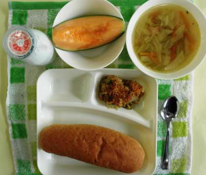 カレードリア、スープ、クインシーメロン、ライ麦パン、牛乳