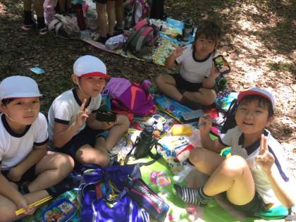お弁当は、広い大きな木のある、緑がいっぱいある場所で食べました。続いてお菓子も食べました。食べ終わった後は、場所を「太陽の広場」に移動して、遊びました。