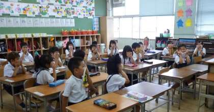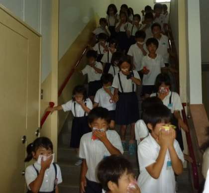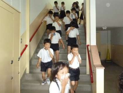 事前に担任の先生から、逃げ方などの注意をきいて、いいよいよ訓練です。1年生は、火災を知らせる訓練のベルの音にちょっとびっくり。でも、ハンカチを口に当てて素早くひなんしていました。