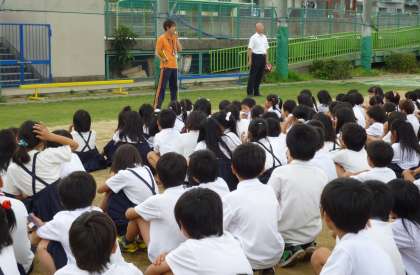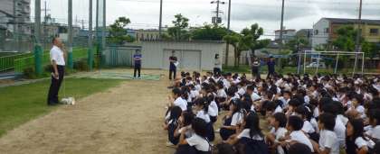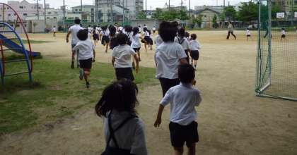 避難訓練では、「お・は・し」(おさない、はしらない、しゃべらない)が基本です。でも、運動場に出たら、できるだけ早く集合場所に向かって走ります。この日の集合タイムは、3分30秒。
