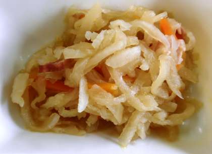 ベーコンの入った切り干しだいこんの煮ものです。ベーコンのうまみで食べやすくしています。