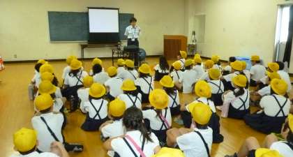 歩いて30分あまりで、消防署に到着。3階の部屋で、職員の方のお話を聞いてから、「火災」と「津波」に関する映像を見せてもらいました。