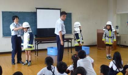 次に、実際に火を消す時に着ている消防服(子ども用)を、全員着せてもらいました。