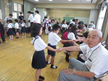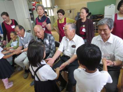 お一人お一人と握手であいさつです。どのお年寄りの方々も笑顔いっぱいでした。