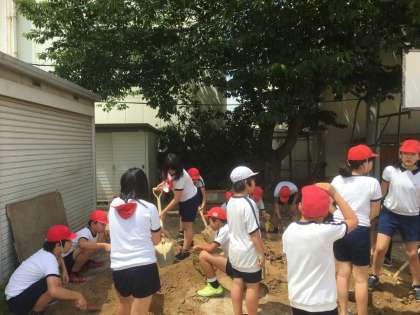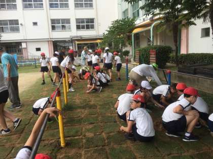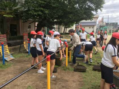 昨日、緑化実行委員会の後、地域の方々も手伝っていただき、6年生が鉄棒の周りに芝生を補植しました。芝生を置いた上に砂をまきました。芝生が青々と育つまでは、しばらく鉄棒が使えません。