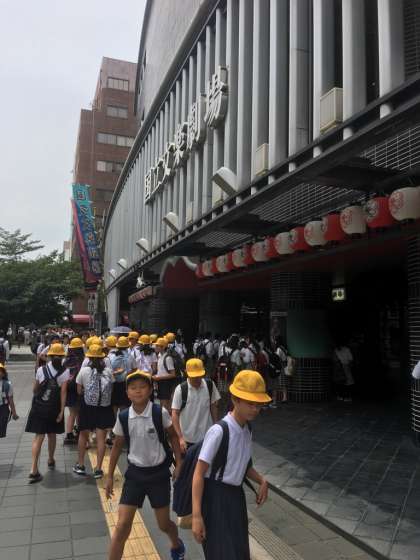今日、6年生は、国立文楽劇場へ文楽の鑑賞に出かけました。「二人三番叟(ににんさんばんそう)」、「解説文楽へようこそ」、「絵本太功記」を鑑賞しました。イヤホンガイドで片方の耳にイヤホンをつけて、詳しい説明が聴きなが文楽を鑑賞できたので、物語の内容がよくわかったようでした。また、「解説文楽へようこそ」では、三味線弾きや人形遣いの方が、実演を交えながら、それぞれの役割や舞台を観るポイントを分かりやすく解説してくれました。