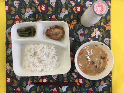 鶏肉のしょうゆバター焼き、みそ汁、三度豆のからしじょうゆあえ、ご飯、牛乳