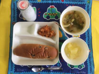 えびのチリソース、中華スープ、りんご缶、レーズンパン、牛乳