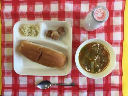 鶏肉のガーリック焼き、ビーンズカレースープ、サワーソテー、おさつパン、牛乳