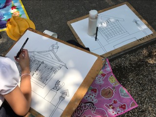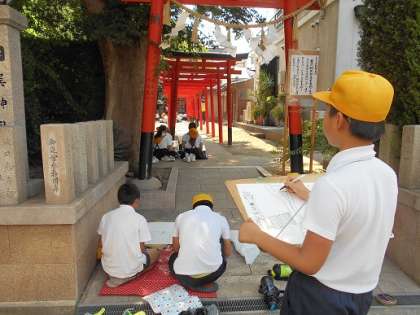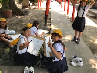 普段見慣れている巽神社も、絵に描こうとすると難しいところも多かったようです。約3時間かかりましたが、みんな絵を完成させて帰って来ました。