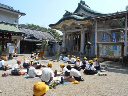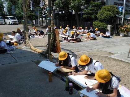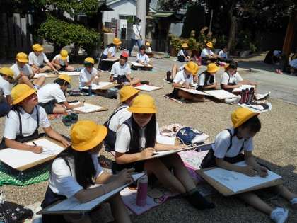 6年生は写生会で巽神社に行きました。巽神社では、参拝の仕方を学んでから絵を描き始めました。