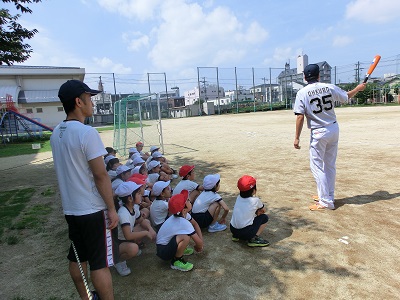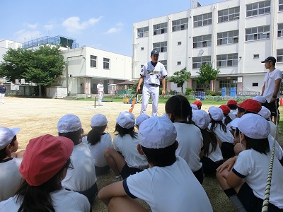 オリックス・バファローズの方々が2時間目と3時間目に野球を教えに来てくださいました。