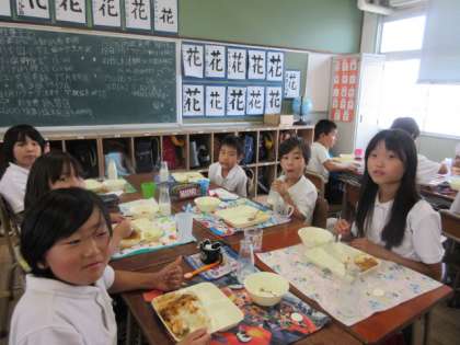 交流給食では、1年生と6年生、2年生と5年生、3年生と4年生のクラス間でメンバーを入れ替えて給食を食べます。