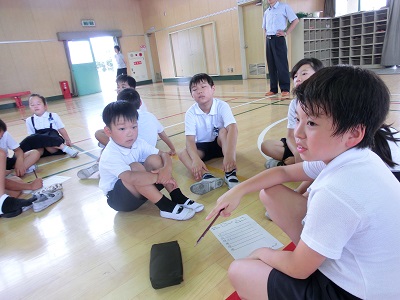 全校集会では、1年生から6年生までが1つの班になる縦割り班でゲームに取り組んでいます。