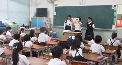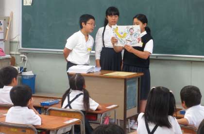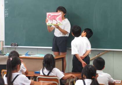 朝の会の時間に、5・6年の図書委員会の人たちが低学年の教室へ行って、紙芝居の読み聞かせをしました。お兄さんやお姉さんが一生懸命読んでくれているのを、1年生や2年生のお友達も一生懸命聞いていました。