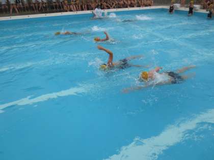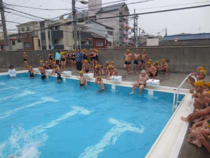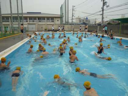 水なれ、基本的な動きを練習したあと、25mを泳いでいます。個々に自分の動きを確かめながら泳いでいました。最後に自由練習をしています。