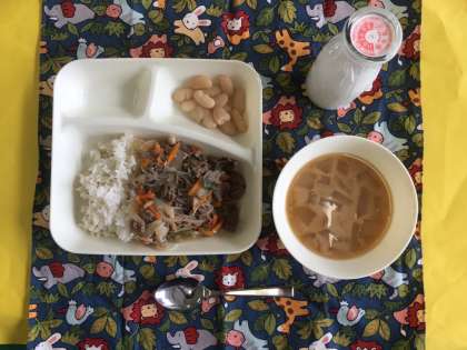 牛丼、とうがんのみそ汁、大福豆の煮もの、牛乳
