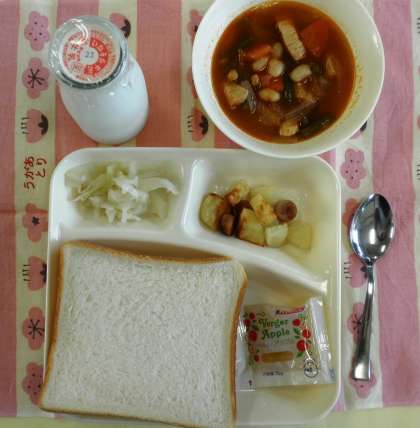 鶏肉とてぼ豆の洋風煮、キャベツのピクルス、ジャーマンポテト、食パン、りんごジャム、牛乳