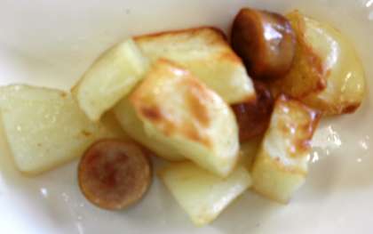 ウインナーとじゃがいもを塩、こしょうで味付けして焼いています。