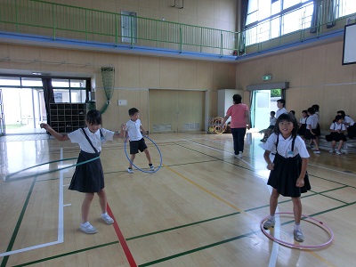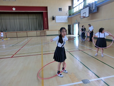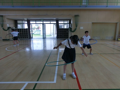 フラフープをとても器用に回す子もいれば、なかなか回せずに汗びっしょりになっている子もいました。