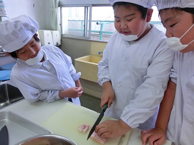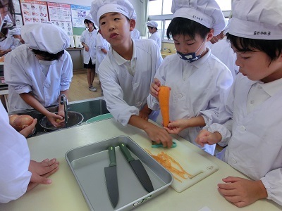 包丁を器用に使って野菜を切る子もいれば、初めて包丁に触る子もいます。