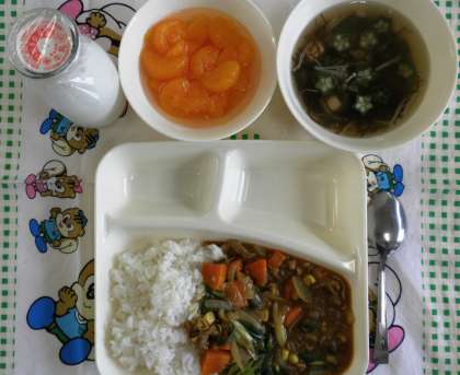 和風カレー丼、もずくとオクラのとろり汁、みかん(缶)、牛乳