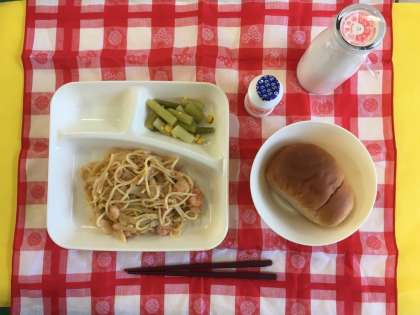 シーフードトマトスパゲッティ、グリーンアスパラガスとコーンのサラダ、はっ酵乳、パン、ブルーベリージャム、牛乳
