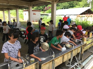 食べた後は…、そうです。みんなで協力して後片付けをしています。