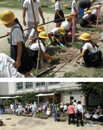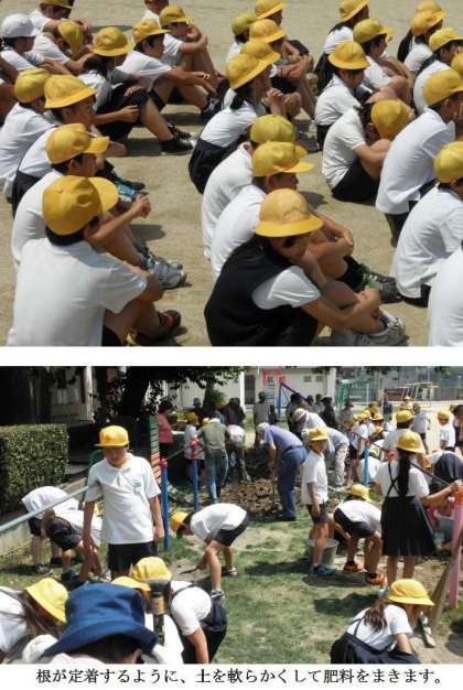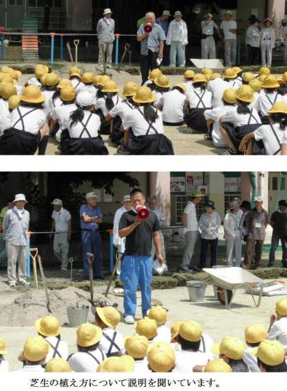 日差しがまぶしい1日でしたが、午後から5年生と地域の皆様と一緒に、運動場の緑化作業(芝生の補植作業)を行いました。たくさんの方にご協力をいただき、ありがとうございました。