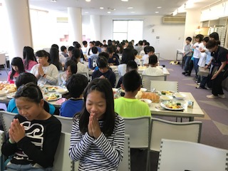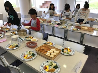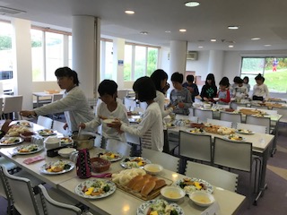 食事係が朝食の準備をしています。スープを入れたりお皿を並べたりしています。そして準備ができたら「いただきます!」
