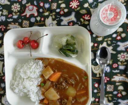ハヤシライス、キャベツのゆずドレッシング、さくらんぼ、牛乳