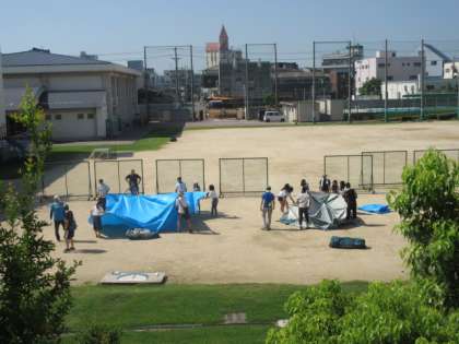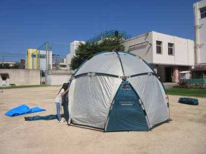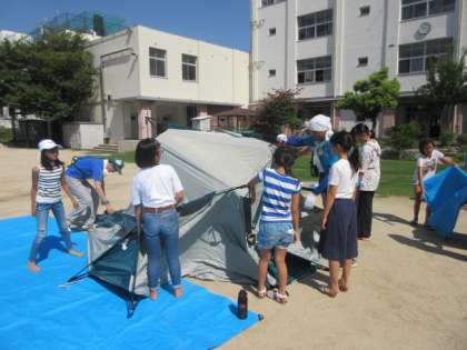 その後、6年生は運動場に出て、PTA役員実行委員の方々をはじめ、青少年指導員、青少年福祉員の方々等地域の方々にお手伝いいただいて、テントを張りました。