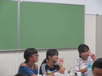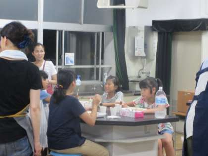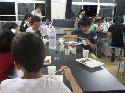 打ち上げ花火のあと、テントに宿泊する6年生はカレーとフランクフルトを食べました。
